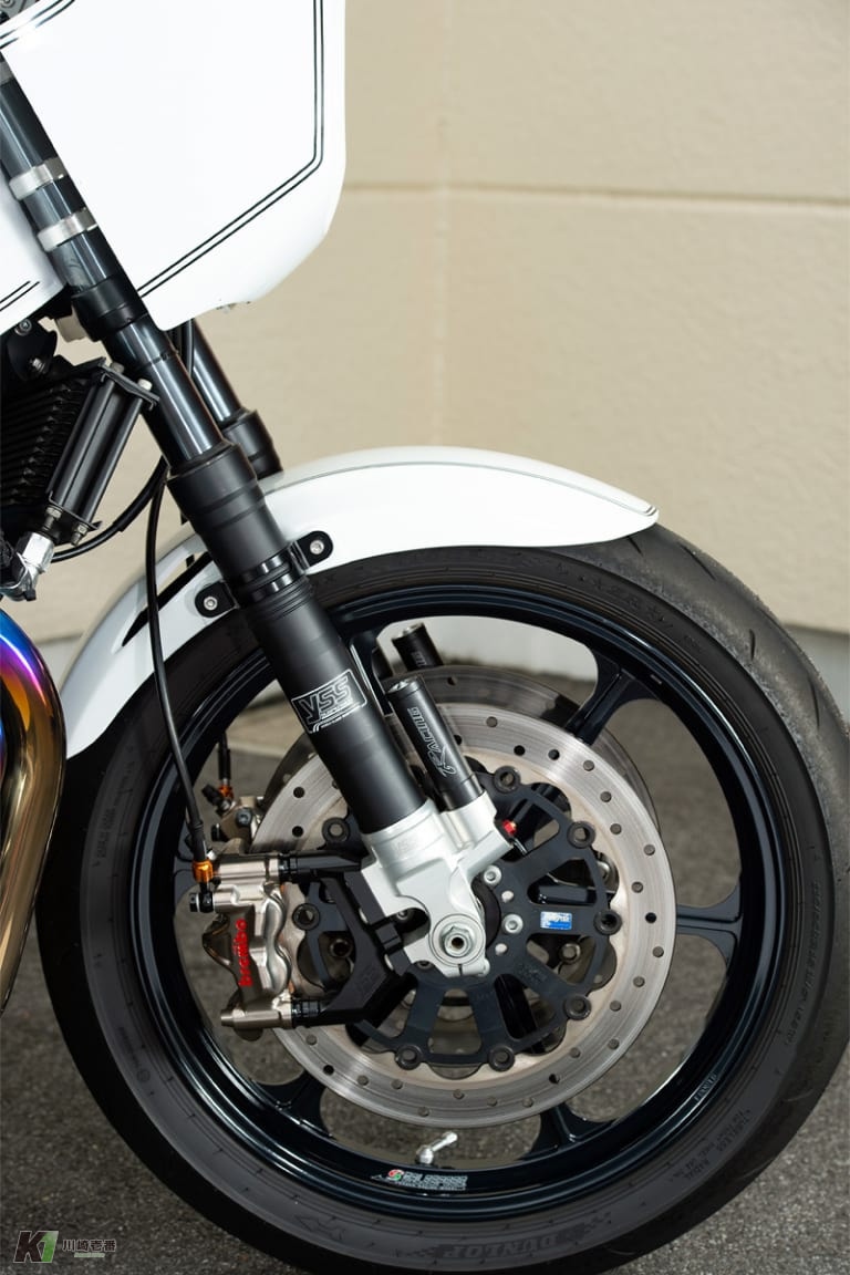 ホイールはアクティブと共同で開発したXJR1200用ゲイルスピードのタイプNを採用することで、18インチのみならず、17インチホイールの使用も可能だ。フロントフォークはXJR1200用トリプルツリーでYSSの影武者をフィッティング。リヤショックもフロント同様YSSとし、レイダウンで装着する。アニーズのスイングアームによってワイドタイヤの強力なグリップをがっちりと受け止める。高性能パーツを徹底的に投入しつつ、誰もが快適かつ安全に乗車できるよう、ラジアルブレーキに合わせたホイールアライメント調整やサスペンションセッティングも行うなど、妥協を徹底的に排したカスタムとなっている。