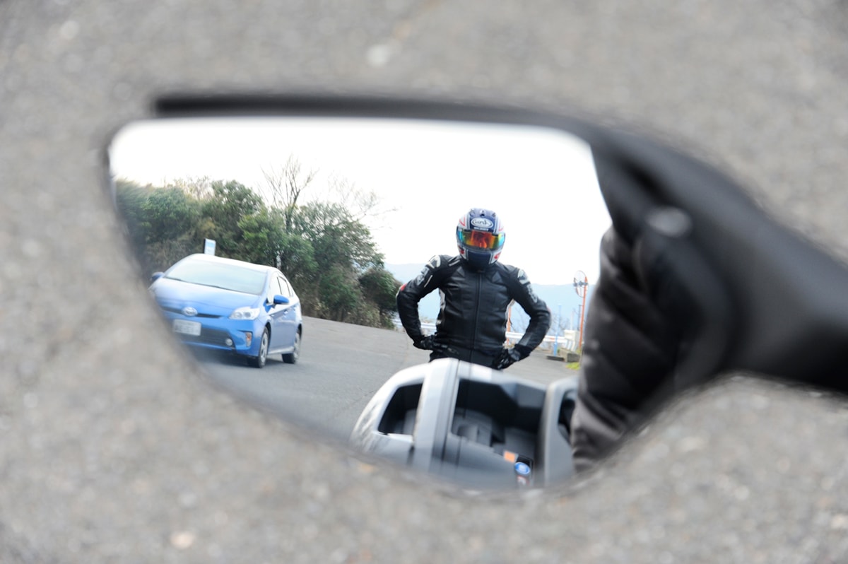 真後ろ方向と左右ともに、広い範囲で確認できる。ただし、パニアケースを装着すると、パニアケースがミラーに映りこみ、視界の一部が欠けてしまう。ミラーのブレはほとんどない。