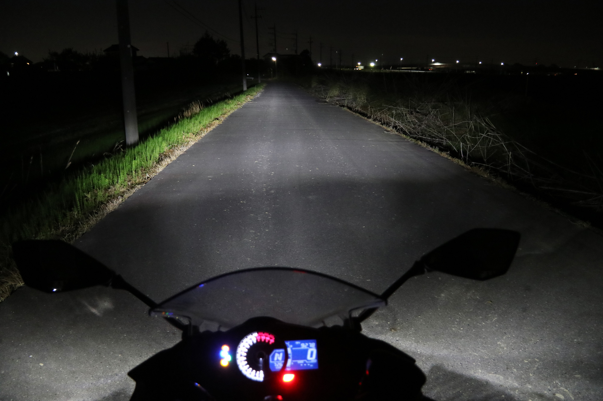 ニンジャ400のデュアルLEDヘッドライトは左右が同時に点灯する。そのためロービームでも左右への照射角はそれなりに広い。ハイビームにするとかなり遠くまで光が届く印象。また手前側の左右もより明るくなるのが特徴になっている。LED特有の白っぽい光なので、視界もクールな印象になる