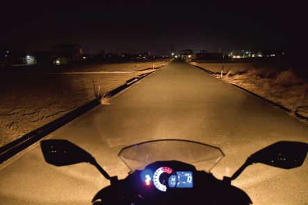 シャープな形状のデュアルヘッドライトはハロゲンバルブ。右側がロービームで左側がハイビームをになう。ロービームでは右側の手前から進行方向を広く照らす。ハイビーム時には両方のライトが点灯するため光量は十分で、遠方はもちろん、より手前まで広く照らし視界を確保してくれる