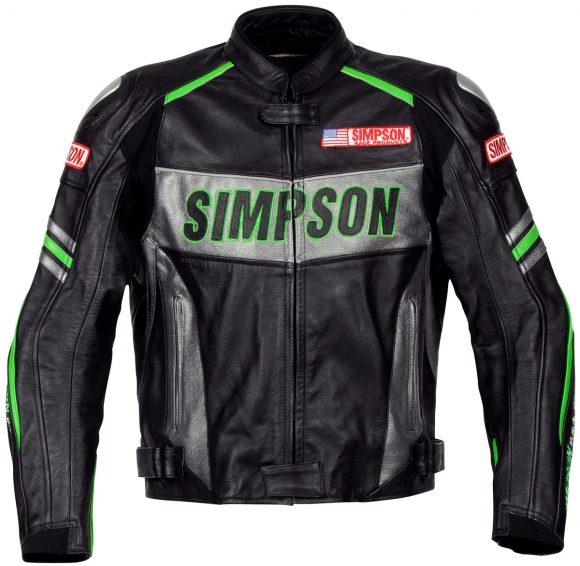 腕やロゴの縁取り部分などにライムグリーンを配したシンプソンのレザージャケット。カウレザー&ケプラーニットを用いたスポーティな仕上がりが特徴のモデルで、肩ヒジにはチタンのアウタープロテクターも備えている。