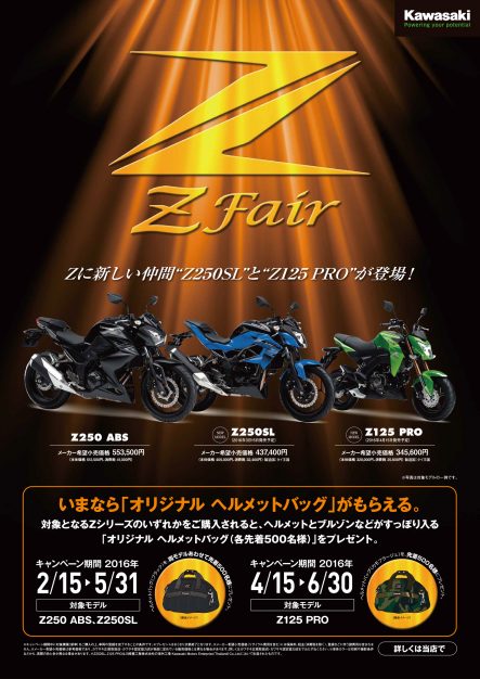 カワサキが、2016年2月15日(月)〜5月31日(火)と、2016年4月15日(金)〜6月30日(木)の2つの期間に、オリジナルヘルメットバッグがもらえるキャンペーン「Zフェア」を実施する。