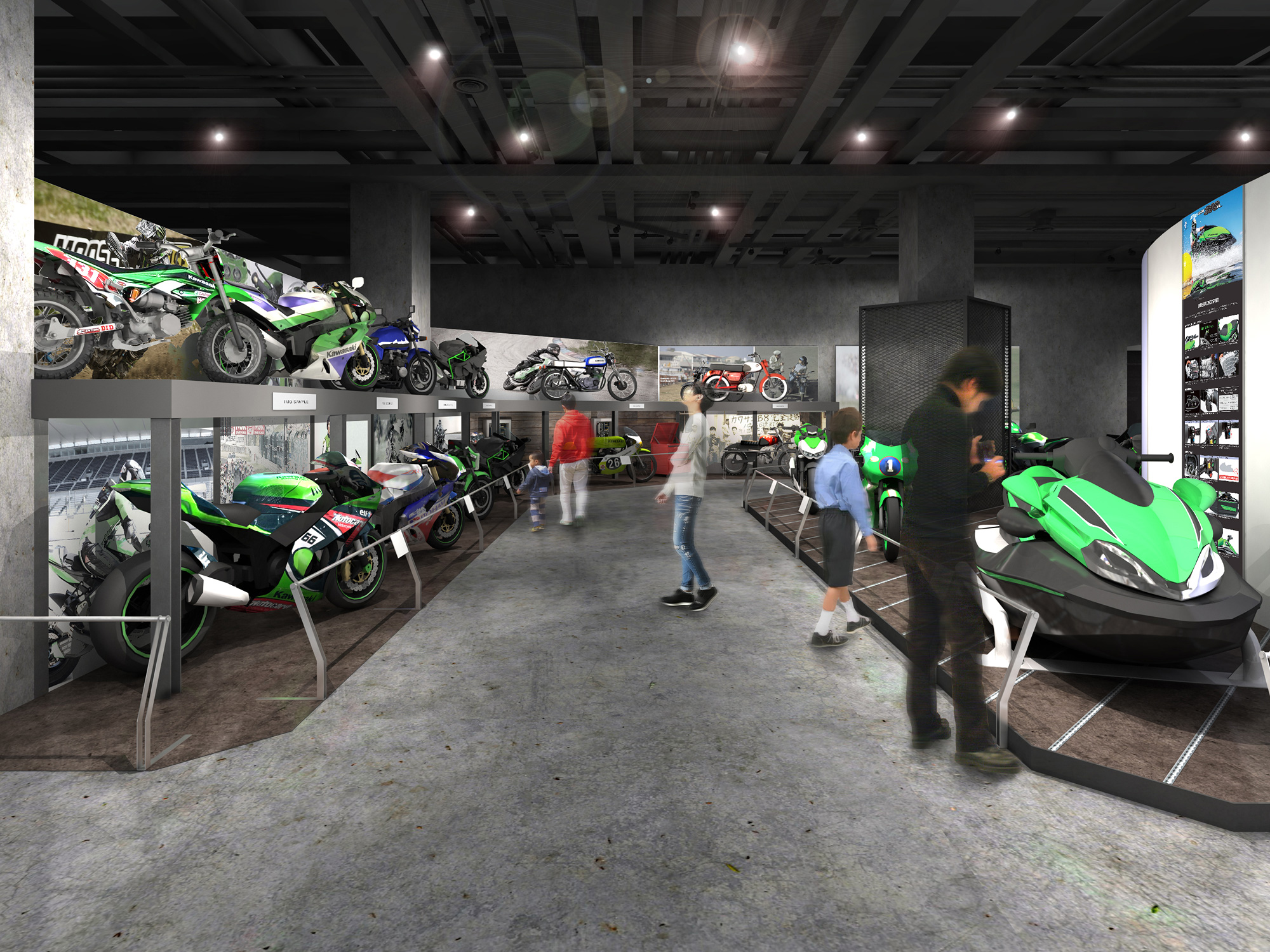 そしてモーターサイクルギャラリーにおいては、カワサキのレーシングマシンも含む名車が多数展示されているヘリテージコーナー、ZX-14Rやニンジャ250SLなどにまたがることができる体験コーナーが設けられるほか、実物のZX-10Rにまたがってサーキット走行を疑似体験できるライディングシミュレーター『RidEX(ライデックス)』も設置される。