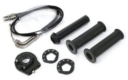 カワサキ車用の車種別キットは、Ninja ZX-14R(12〜15)/Ninja ZX-10R(11〜16)/Ninja ZX-6R(09〜14)/Ninja 250R(08〜12)/Ninja 250(13〜15)用が用意されており、キットの内容は、スロットルホルダー、スロットルパイプ、グリップ(120mm/左右セット)、スロットルワイヤー、ブラケット(角度違い2種)だ。ブラケットサイズは車種ごとに最適なサイズ設計となっている。