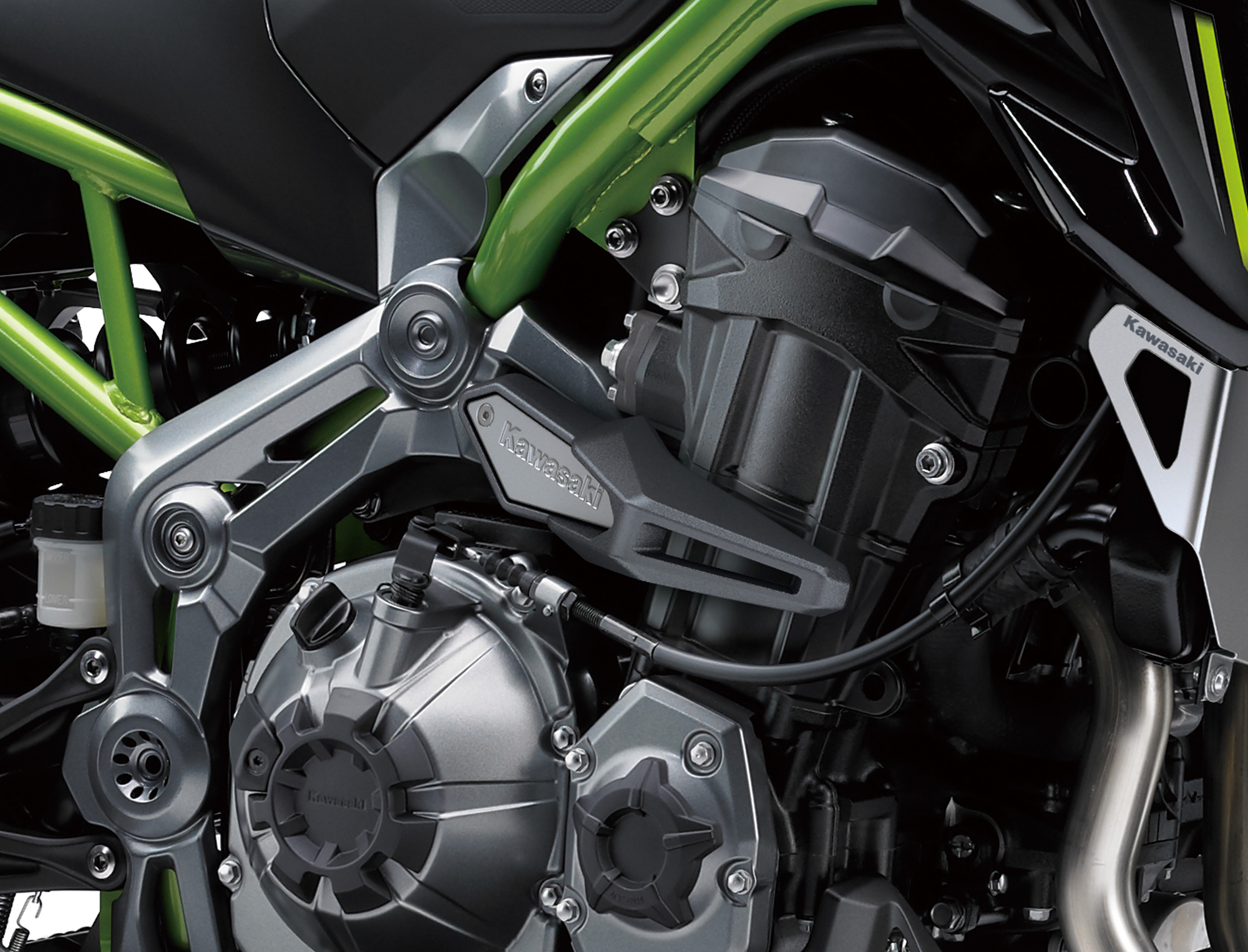Z1から続くカワサキ伝統の900ccエンジンを搭載するZ900。このエンジンはZ900RSにも用いられているもので、ボア×ストローク=73.4×56(mm)の設定を同じくする948ccの水冷4ストローク DOHC 4バルブ 並列4気筒エンジンだ。