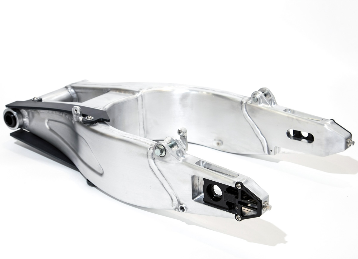 プレスフォーミングスイングアームはもともと、アクティブがリリースしているカスタムスイングアームで、アルミプレス材(7N01)を用いた中空構造が特徴。軽量な仕上がりながら、縦方向の剛性を確保しつつ横方向には適度なしなりを持たせた、接地感やハンドリングの向上を目指したパーツとなっている。