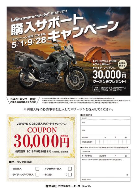 このキャンペーンは、VERSYS-X 250シリーズを購入する際に3万円分のクーポンが利用できるというモノ。クーポンは車両の購入はもちろんのこと、アクセサリーやライディングウェアなどの購入費用に充てることが可能だ。