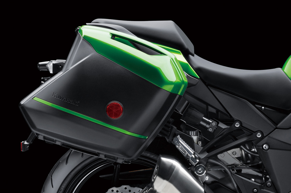 カワサキロゴが刻印されたGIVI製純正パニアケースセットは、左右それぞれ28ℓというフルフェイスヘルメットが収納できる容量を持つ。装着は標準装備のタンデムグリップをそのまま使うことができ、取り外した状態でも外観に違和感がないなど、車両とのマッチングは完璧だ。また取り付け位置は可能な限りバイクの中心線に近づけているため、パニアケース自体のはみ出しが少なく、狭い場所での取り回し等の不安もないとのこと。