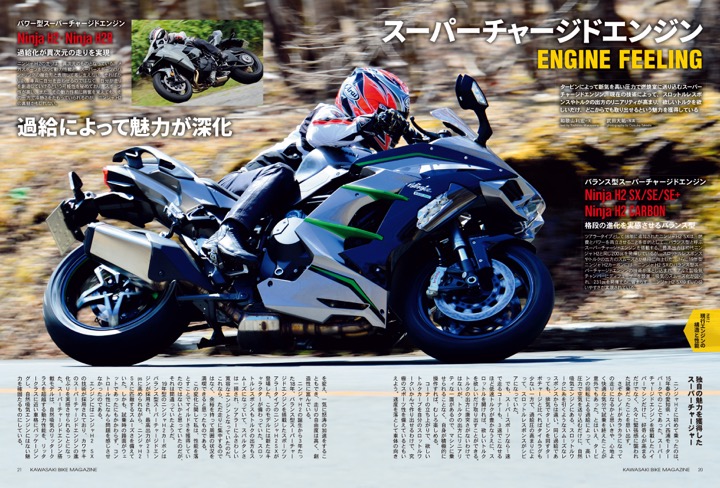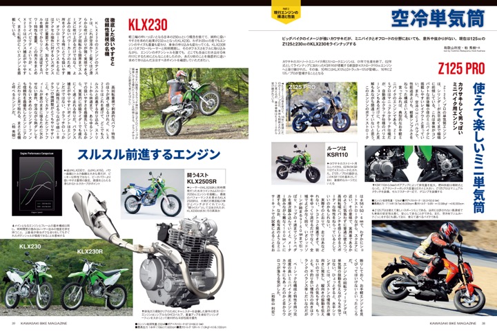 近年、スーパーチャージドエンジンを採用したり、250cc水冷並列4気筒エンジンを発表したりするなど、カワサキのエンジンは注目の的となっている。そこで今月号の巻頭特集では、最新エンジンを中心に、カワサキのエンジンについて解説する。とくに現行モデルに採用されるエンジンに関しては、メカニズムとエンジンフィーリングの2つの観点から徹底的に掘り下げた。巻頭特集の他、昨年21周年記念を迎えたカワサキコーヒーブレイクミーティングのレポートやニューモデルインプレッションなど、見逃せないカワサキネタが満載となっている。