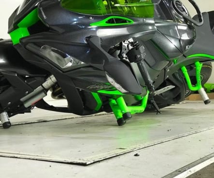 ZX-10R用のエンジンガードはベースカラーがブラックだが、オプション(8,400円)で製品画像のようなライムグリーンなどへのカラーの変更も可能となっている。