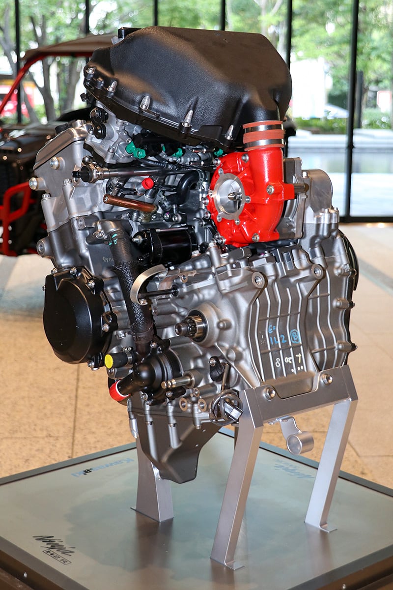 EV二輪研究車とHEV二輪研究車といった電動エンジンに加え、カワサキは水素エンジンも研究している。事業方針説明会では、その水素エンジンに向けて研究中の二輪用直噴エンジンが展示された。このエンジンは、ニンジャH2シリーズのエンジンをベースとして、燃料噴射システムに手が加えられたもので、現在のところ水素で実動させているわけではないが、今後、このエンジン形式をベースに水素エンジンを開発していく計画だ。