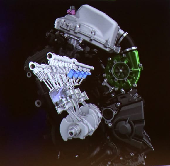 では、どのように燃料噴射システムが変わっているかというと、スロットルボディとサージタンクに設けられた既存のインジェクターに追加して、燃焼室に直接燃料を噴射させるための直噴インジェクターが設置されているのだ。つまり、現段階では3パターンのインジェクターが採用されていることになる。これにより想像できるのが、ガソリンと水素の混焼だ。その場合、インジェクターを3パターン装備するのか、また、どのインジェクターから水素、どのインジェクターからガソリンを噴射させるかなどなど、さまざまな妄想が膨らむ。ただ、カワサキの事業方針説明会で公開されたCGでは、燃焼室に直接燃料を噴射させるインジェクターから水素が噴射されているため、おそらくこの直噴インジェクターから水素が噴射されるのではないだろうか。