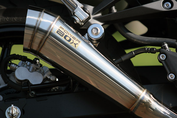 “パワーボックス”とはショート管スタイルにありがちな神経質な特性と爆音を払拭し、力強く雄大な加速力を引き出すべく開発されたSP忠男独自の構造。このニンジャ250R用パワーボックスマフラーもスタート直後からの強い加速力と低速時の強力なトルク感を狙い製品化されたのだ。また、コンパクトなスタイルながらもジェントルなサウンドを奏でる政府認定品となっていることも特徴の一つである。
