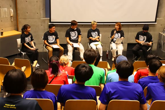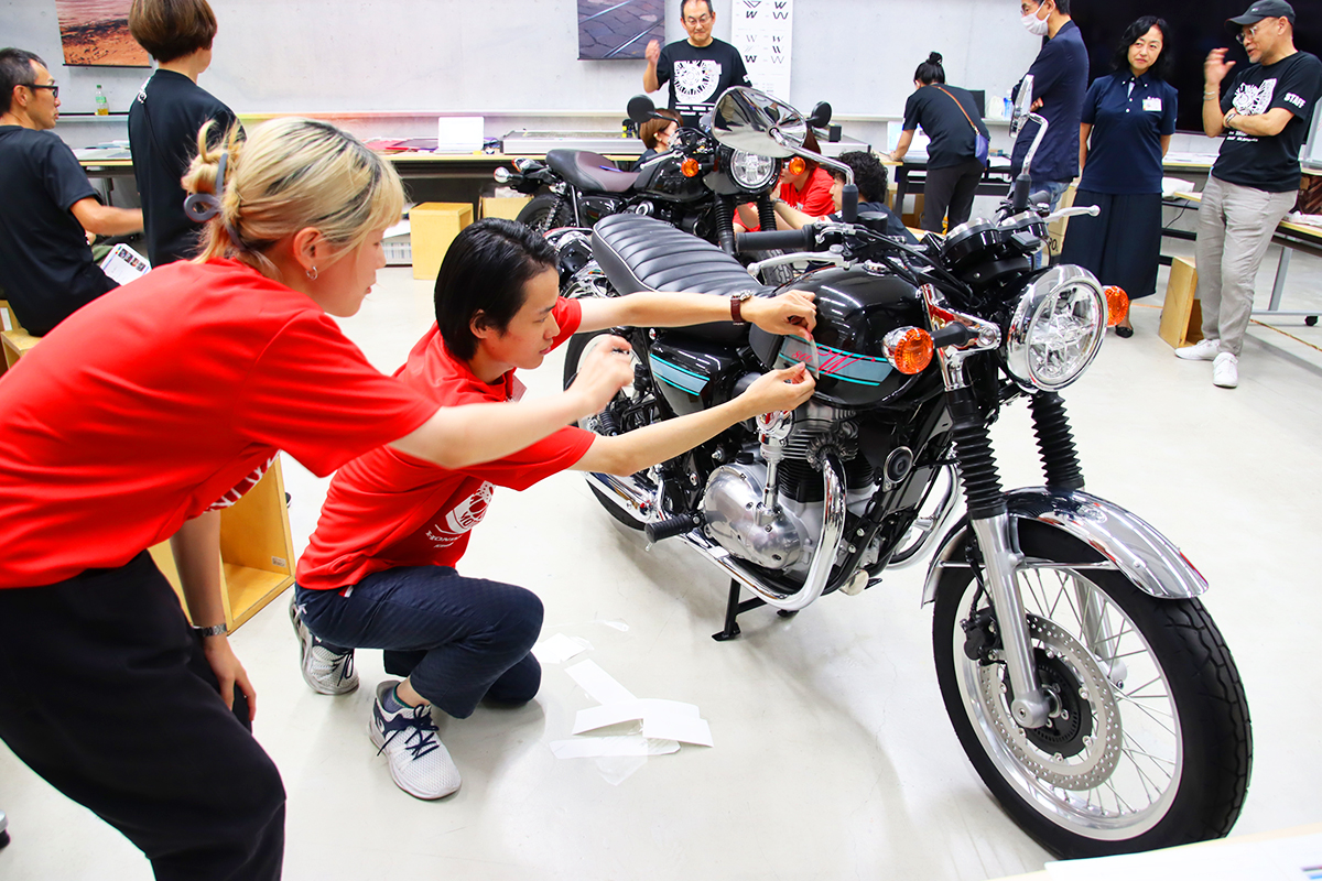 学生は4グループに分かれ、それぞれ赤、青、水色、緑の二輪デザイン公開講座オリジナルTシャツを着用。スタッフは黒のTシャツを着用する。