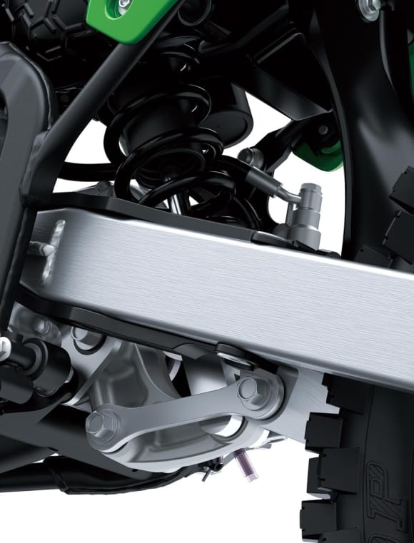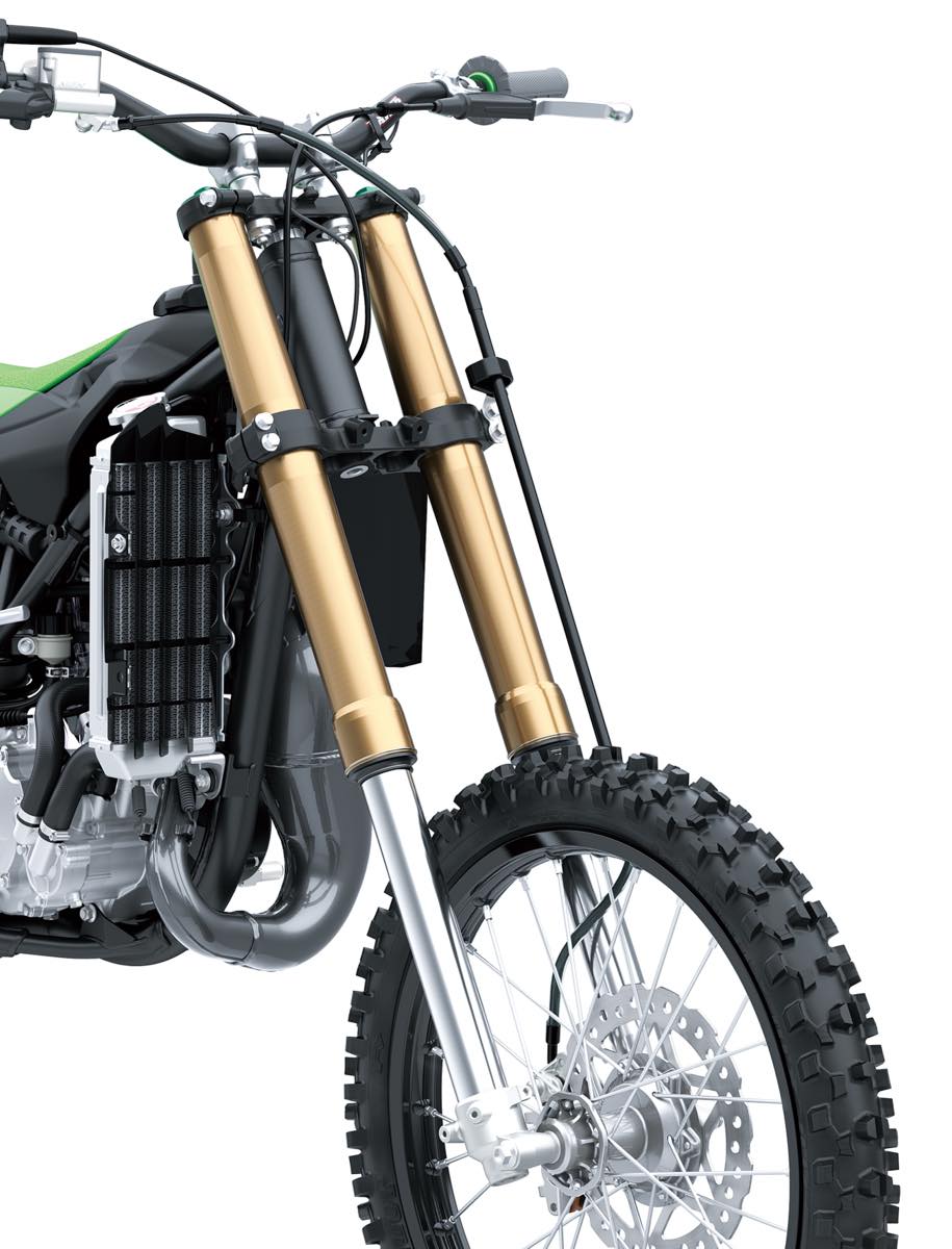 リヤショックはロッド径を ø14㎜に拡大し、シリンダー長も390㎜へ10㎜延長していて、これによりフルストローク付近での減衰特性と耐底付き性能が強化された。また、圧側の高速減衰力の減衰調整機能が追加された。また、KX112とKX85 Lはリンケージロッドも変更されて、リヤホイールのトラベル量がフルサイズのKXと同じ305㎜へとアップしている。