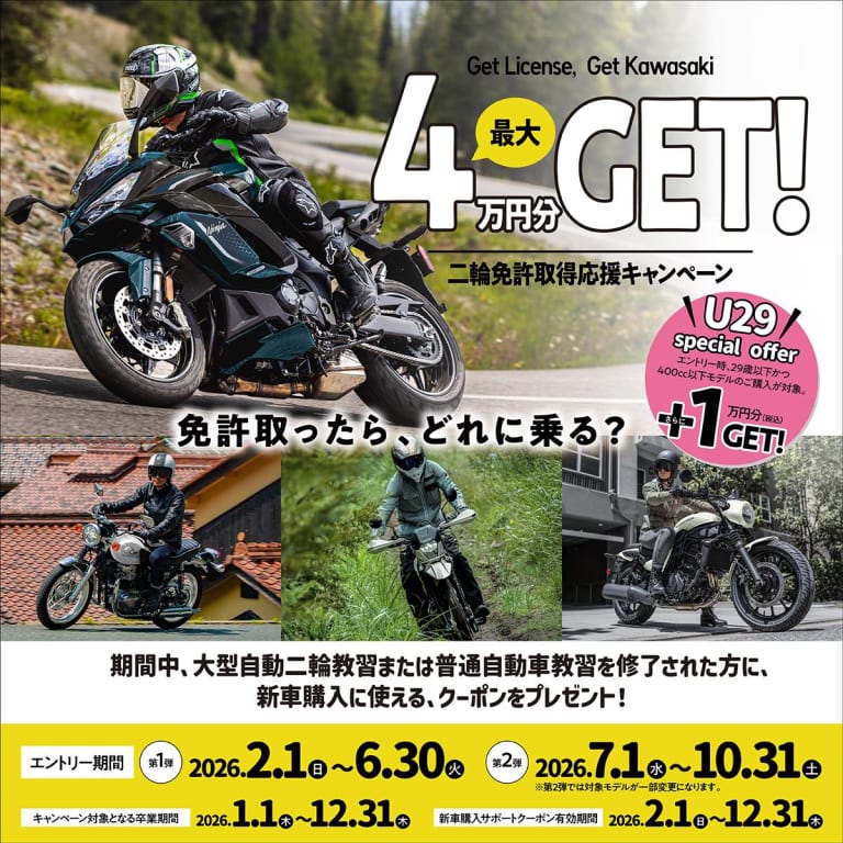 これから二輪免許(普通自動二輪もしくは大型自動二輪)を取ってカワサキの新車を購入したいと思っている人に朗報。現在カワサキ 2026年“二輪免許取得応援キャンペーン”の第一弾が実施中で、このキャンペーンを利用すれば、最大4万円分の新車購入サポートクーポンがゲットできるぞ。