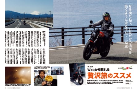 誰もがなんとなく感じていると思うのだけれど、ツーリングと“旅”はイコールではない。ただし、その違いに深く踏み込んだ人はさほどいないだろう。そんなわけで、今回は“旅”を意識して特集を組んでみた。とはいえ、旅を快適にするアイテムの紹介や車両カテゴリーに分けて、このバイクで行ってほしいスポット5選のような実用的なコンテンツも用意してあるので、気楽にツーリングを楽しみたい人にも役立つはずだ。
