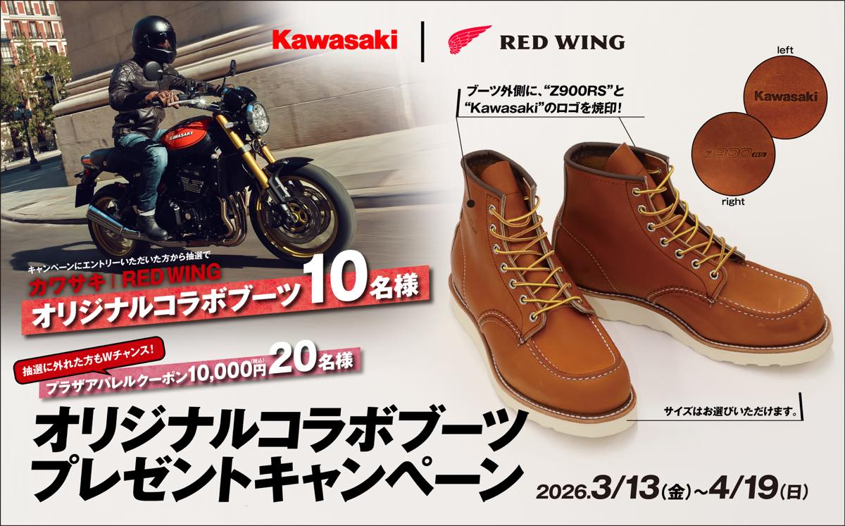 現在、カワサキモータースジャパンではアメリカの老舗ブーツブランド“RED WING”とコラボレートしたオリジナルデザインのブーツが当たるプレゼントキャンペーンを開催中だ。2026年4月19日(日)までにキャンペーンサイト内エントリーフォームから応募した人の中から抽選で合計10名にオリジナルコラボブーツが当たる。さらに、ブーツの当選からもれた人の中から抽選で20名に、全国のカワサキプラザで利用できるプラザアパレル購入サポートクーポン1万円分がプレゼントされる。