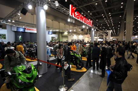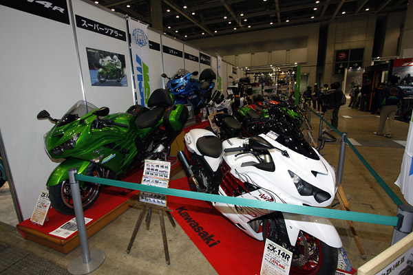 カワサキブース以外にも、パーツ・アクセサリー出展ブースではエンジンから車体、そして外装関連まで、カワサキ車に関係する多くのアフターパーツが展示されていた。やはり目をひいたのはNInja ZX-14R用のパーツで、早くもマフラーを展示するブースがあったり、オールペイントやパニアケースの装着といったNinja ZX-14Rのカスタム車をたくさん展示するブースも見受けられた。
