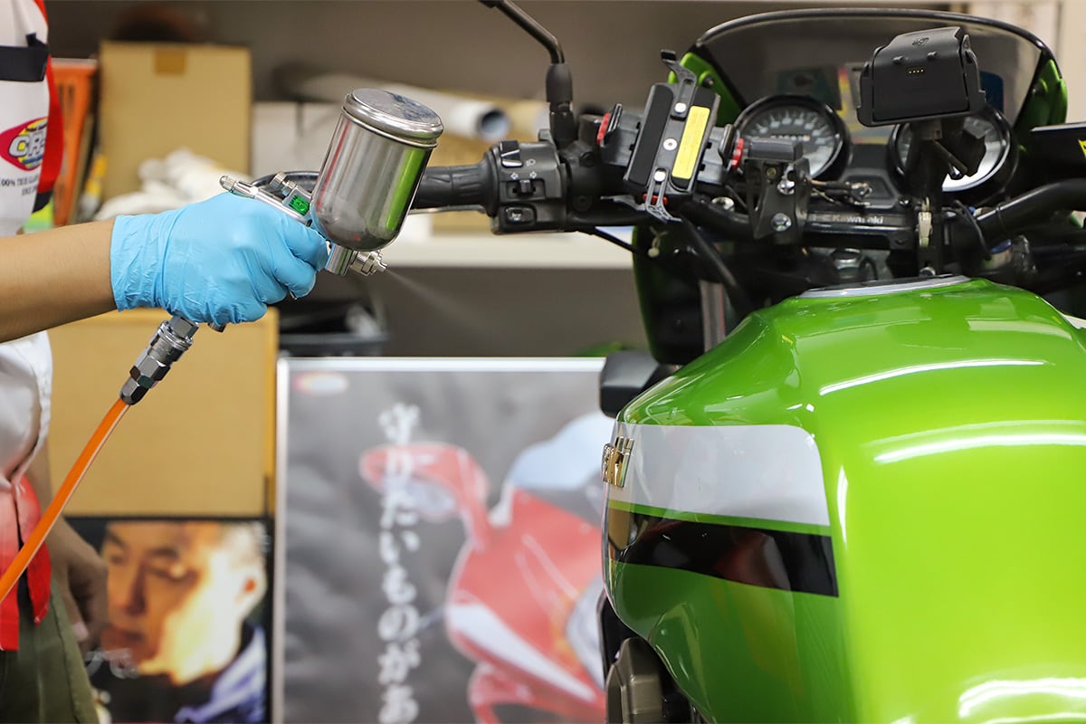 という流れになる。ちなみに今回施工したZRX1200Rの場合は、外装コース(タンク/フロントフェンダー/カウル/シートカウル)を実施した。
