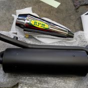 マフラーはZ125プロ用に開発されたRPM製を装着した。KSR110用のマフラーを流用するためには、O2センサーの取り付けボスを増設するなどの加工が必要となるだろう。