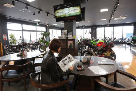 ショールームに足を踏み入れると、カワサキプラザならではのリラックスをうながす“グリーンエスケープ”という香りで店内は満たされている。余裕を持って展示された車両は、スタッフに声がけすれば基本またがることができる