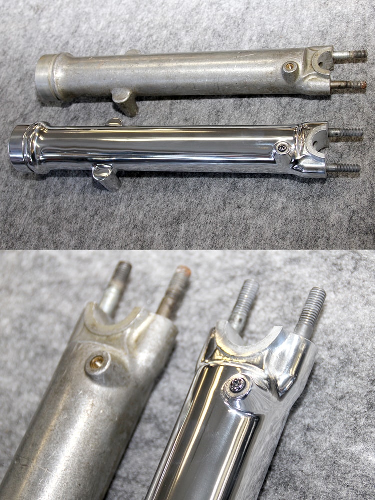 アウターチューブのバフ掛けは右の写真でも紹介した。ドレスアップ効果は高く、見栄えはかなりよくなる。さらに性能を高める方法として、強化スプリングやイニシャルアジャスターに交換したり若干高価ではあるが、インナーチューブにチタンコートをほどこす方法もある。「抵抗を減らし動きをよくして乗り心地を高めます。高価な社外品に換えなくても性能アップできますのでご相談ください」